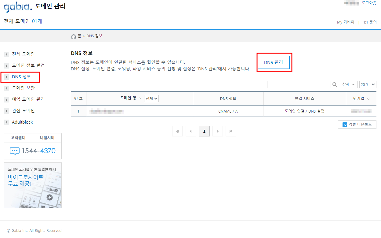 가비아에 로그인 ->서비스 관리-> 서브도메인을 추가할 도메인의 관리버튼