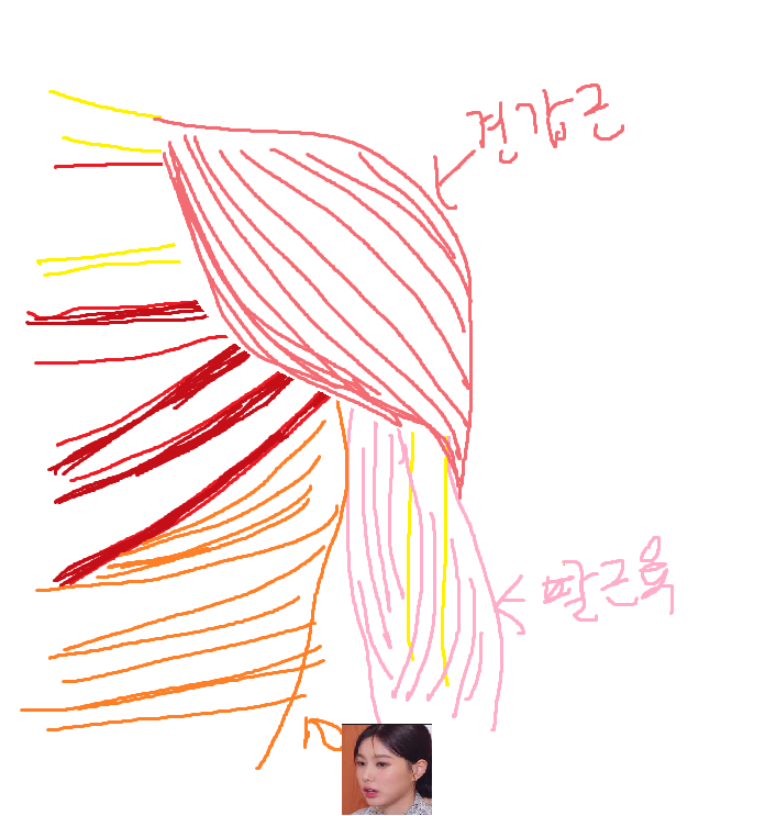 이 이 근육들을 앞으로 돌려보면 대충 이런 모양세가 나옵니다! 저기 3가지 근육들이 옹기 종기 뭉쳐진 곳이 보이시나요? 저 사이에 스트레칭 볼을 끼워서 둥가둥가 근육들을 풀어줄겁니다.
