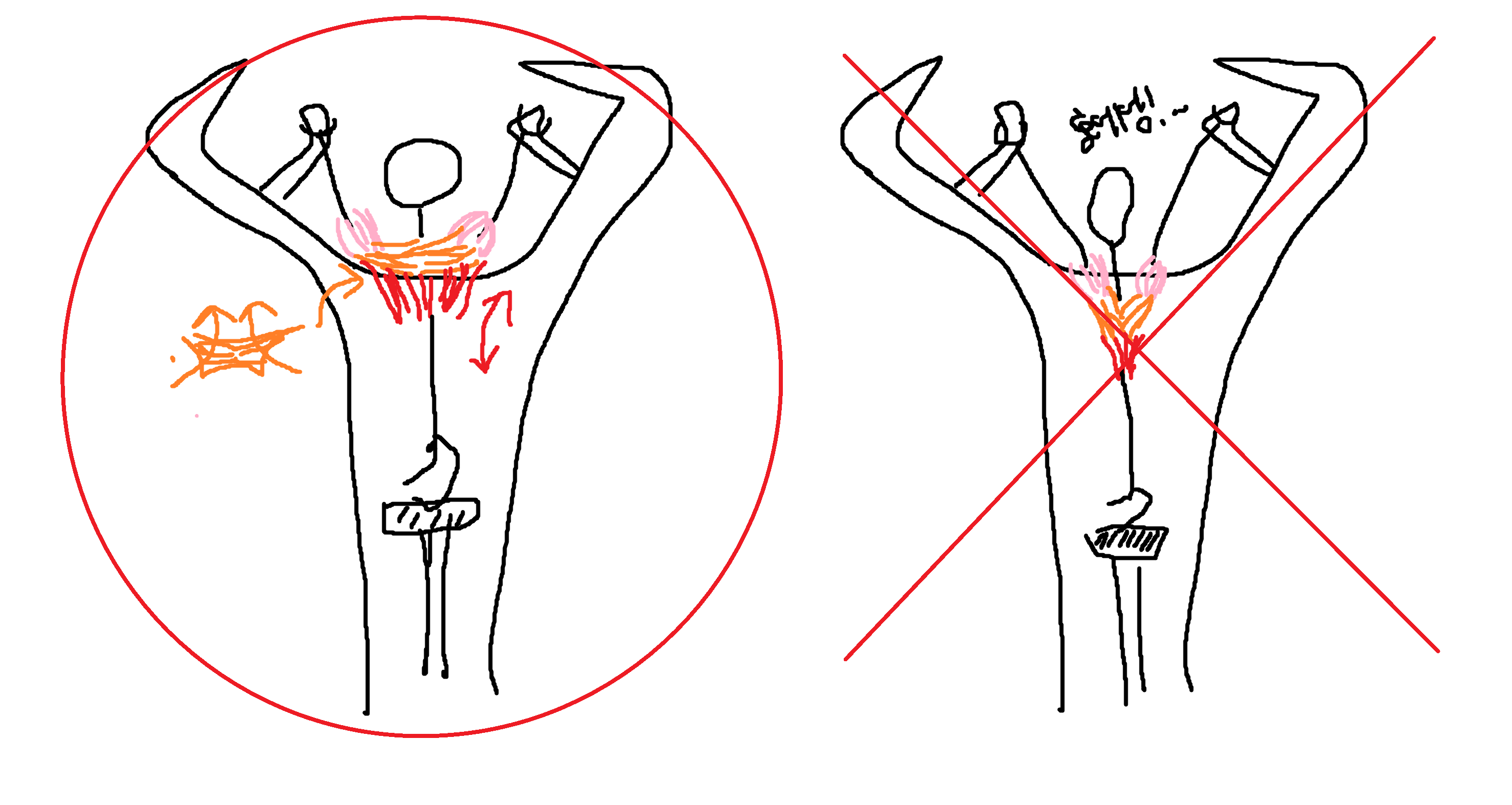 그리고 트레이너 선생님이 자극이 잘 될 수 있게 위에서 지긋이 눌러주십니다. 그럼 누구나 가릴것 없이 극락을 느낄 수 있습니다. 이렇게 15회씩 좌우 2세트씩 풀어주면 어깨가 탈골된채로 한결 가벼워진 어깨로 어시스트 풀업을 즐길 수 있습니다.
