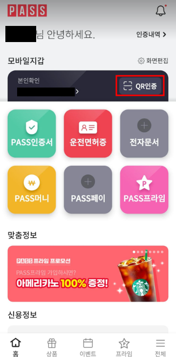 저번에 보여드렸던 제 PASS앱 등록 상태예요!. 핸드폰 켜시구 똑같이 PASS앱 접속해주세요. 그럼 본인확인 전화번호 오른쪽에 빨간 체크박스로 표시해둔 QR인증 보이시나요? 저걸 누르고 QR코드를 찍기만 하면 된다는거! 안되더라도 QR코드 아래있는 숫자코드로 간단하게 인증가능해요!