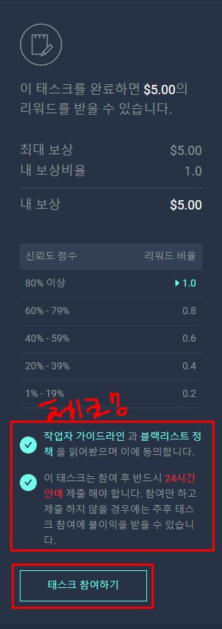여기서 정책 2개에 동의하고 태스크 참여하기를 통해서 해당 태스크에 참여할 수 있습니다.