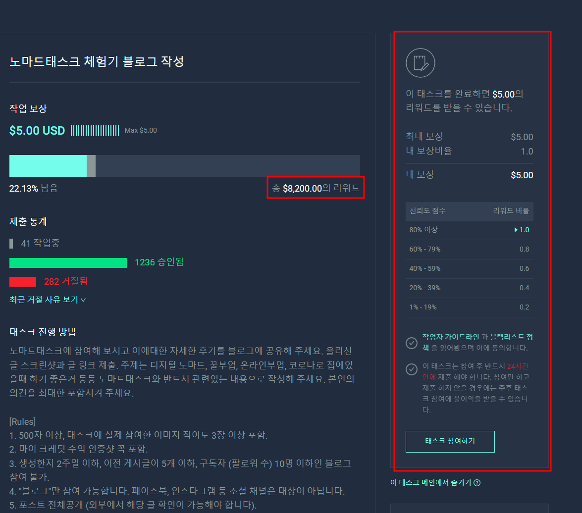 요런식으로! 지금까지 총 얼마의 리워드가 남아있는지, 현재 작업중인, 승인된, 거절된 태스크 참여가 얼마나 있는지, 태스크 참여시 받을 수 있는 예상 리워드까지 표시되어 있습니다.
