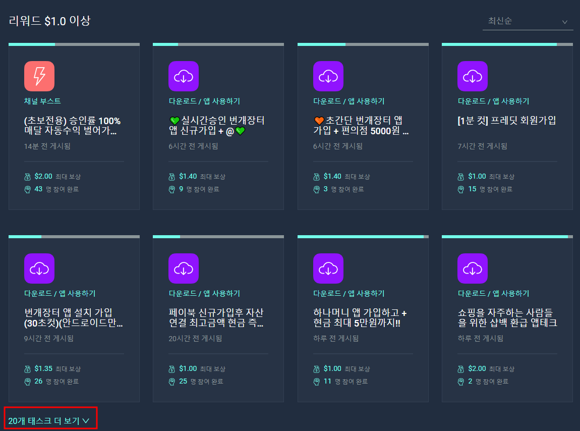 꿀 TIP! 아래로 내리다보면 몇개월에서 몇 년되었지만, 판매자가 삭제하지않고 방치해둔 태스크가 있습니다. 최신 태스크를 통해 리워드비율을 높이고 이런 오래된 컨텐츠를 노려보는 것도 좋은 전략이 될 수 있습니다.