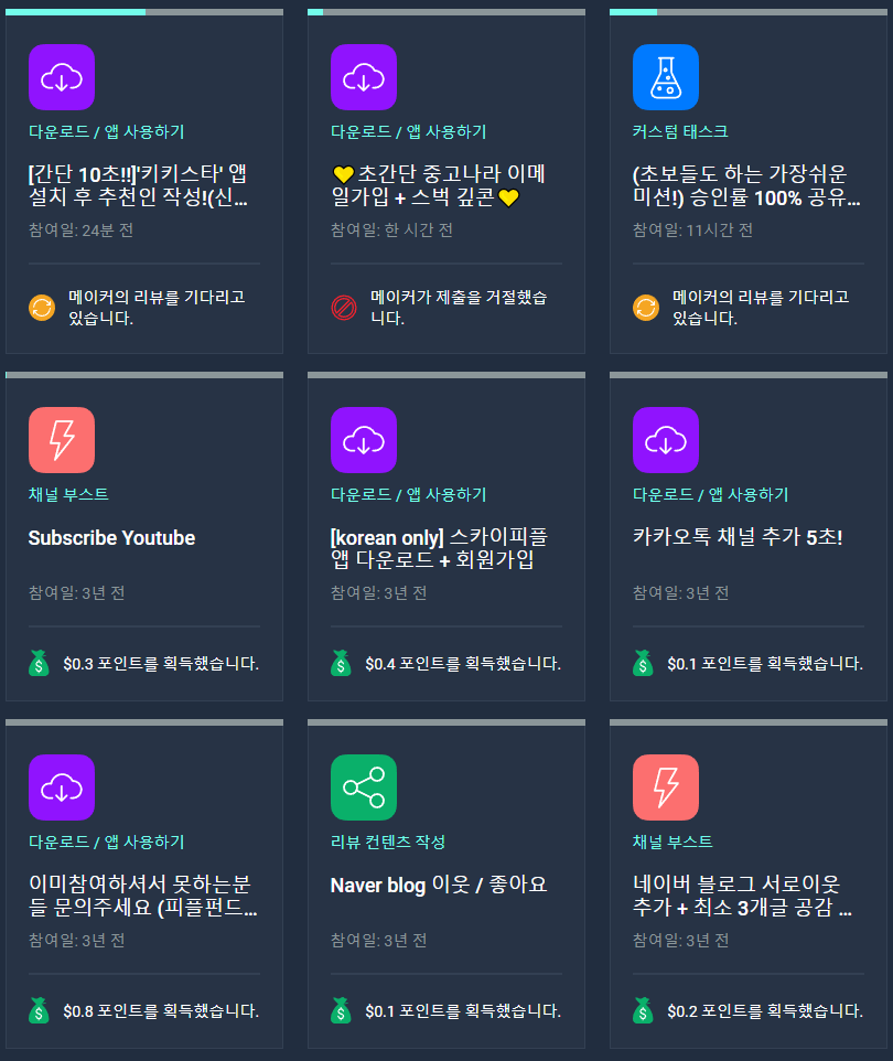 인증이 어렵고 복잡하고 시간이 많이 들수록 리워드가 올라가고, 반대로 쉽고 간단한 좋아요, 후기남기기, 유튜브 구독 등은 1달러 미만인 경우가 많습니다. 즉, 박리다매의 전략을 사용하냐, 양질의 컨텐츠만 사용하느냐가 관건이겠죠.