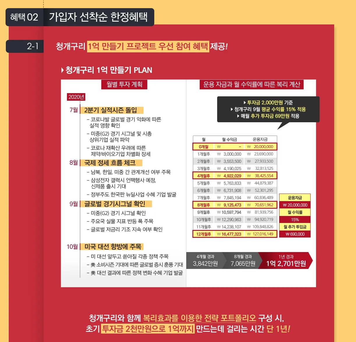 지금 진행중인 1억 만들기 프로젝트에 참여하면 월별 투자계획과 내 투자요건에 맞는 복리계산기, 그 밖에 다양한 청개구리 투자클럽 만의 강의, 도서, 할인혜택을 받을 수 있다구!