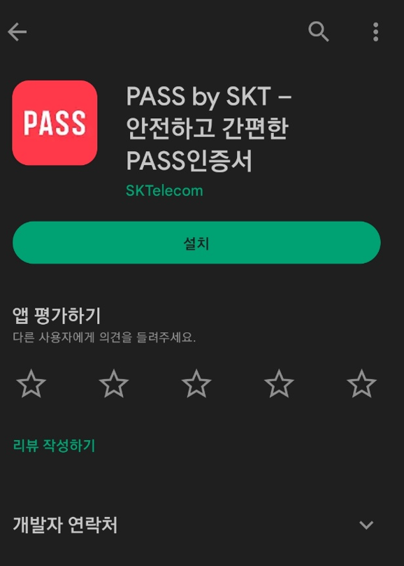 1. Play Store에서 'PASS' 로 검색해서 PASS 인증서 앱에 들어가주세요.
