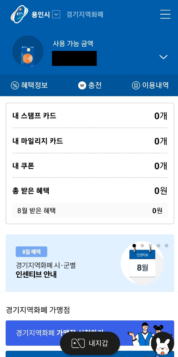 - 그러면 짠 메인화면에서 제 지역화폐 카드와 잔액을 확인할 수 있는데요,