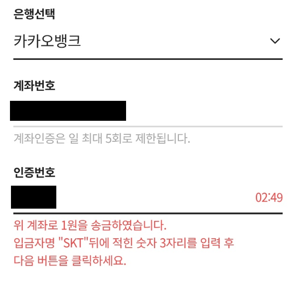 - 저는 카카오뱅크로 진행했습니다. 인증요청을 눌러주시면 계좌에 SKT000 의 입금자로 1원이 입금될거예요.