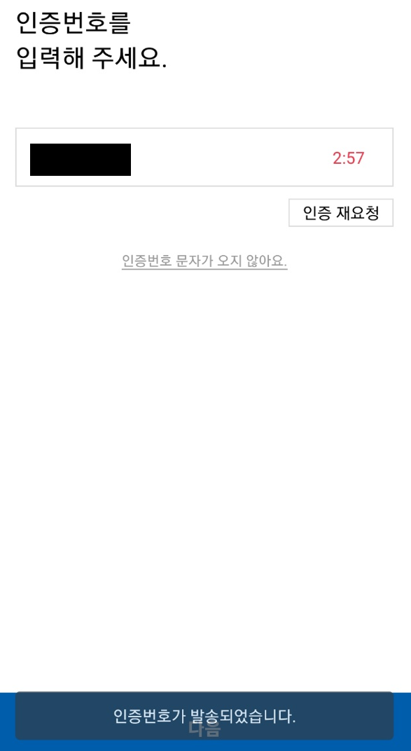 - 다음 누르시면 인증번호가 발송될텐데, 문자가 도착하기전에 자동으로 입력될거예요!