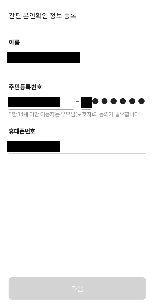 - 간편 본인확인 정보 등록해주세요! 이름 주민번호 앞자리, 뒷자리 첫번호, 휴대전화 번호만 입력하면 끝!